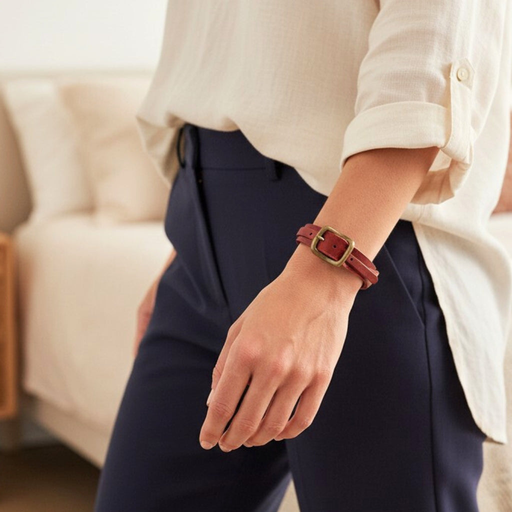 編み込みのやわらかな曲線と、日本製の上質なソフトレザーが心地よく手首にフィットします。